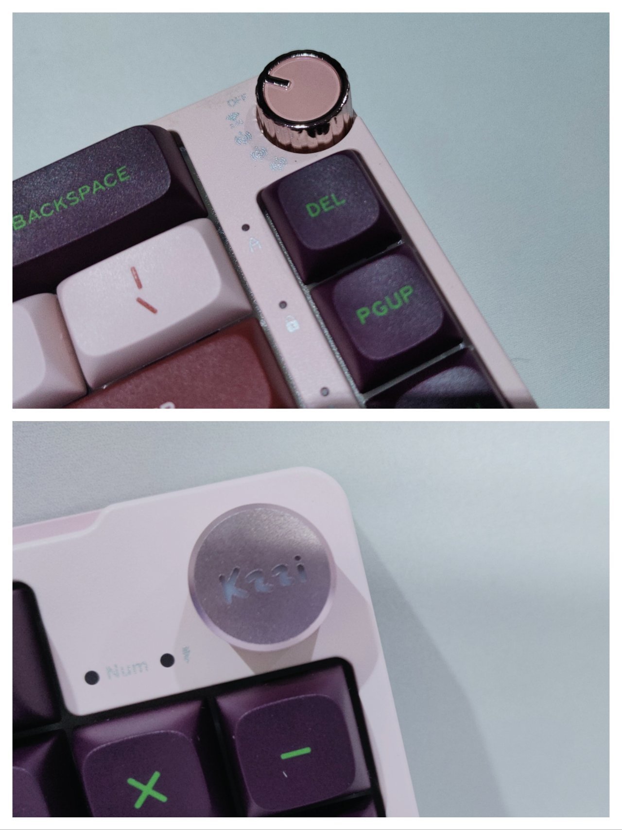 两者的右上角都很相似,都有一个旋钮但是他们俩的功能各不相同,k68pro的旋钮可以用来切换连接方式,而K20的旋钮上面有一个单独的标识,辨识度很高,然后他是可以用来调节音量的按住之后就是静音模式。如果你平常喜欢看看电影剪剪视频的话还是挺方便的。当然了这里有人会吐槽为什么K68 Pro上面的不是音量调节,平常也不能经常用到啊,我这边感觉kz本身本身的意图是吧K20和K68 Pro配套卖的,所以可能就会照成这么一个现象