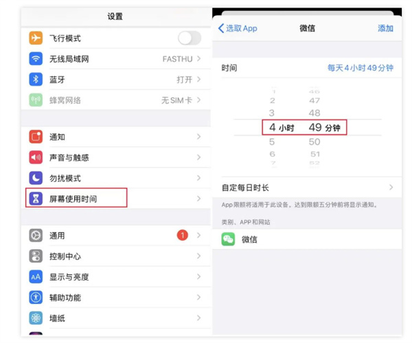 打开“设置”,点击“屏幕使用时间”,选择你需要限额的应用后进行使用时间的设置即可。