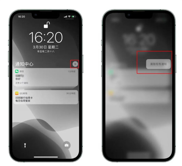 在锁屏界面,长按“ x ”号,即可一键删除所有的弹出消息。