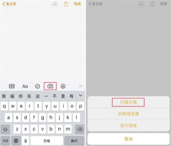打开备忘录,点击“照相机”图标,选择“扫描文稿”,拍摄纸质文件后点击“完成”就可以了。