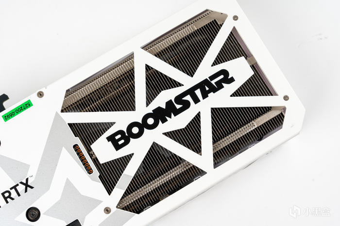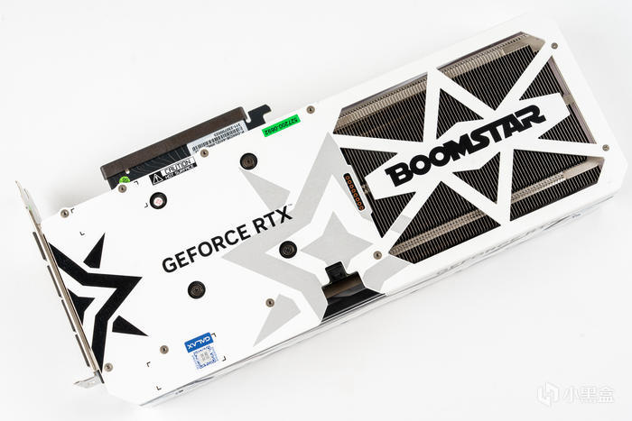 显卡的背板也是挡板处星曜logo,中间GEFORCE RTX的英伟达logo,右侧则是镂空大面积的贯穿散热与星曜logo BOOMSTAR