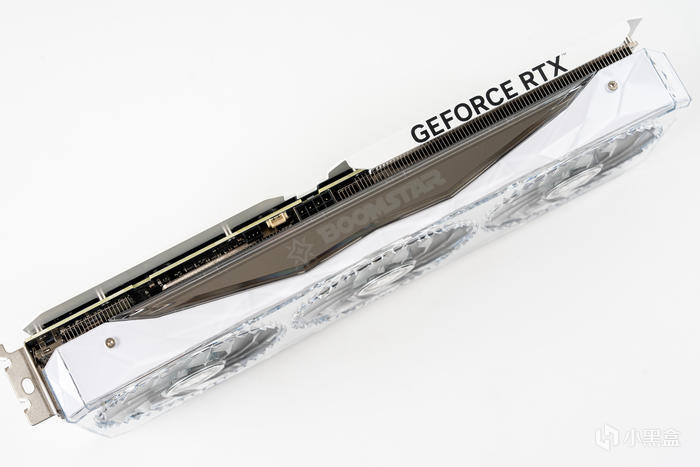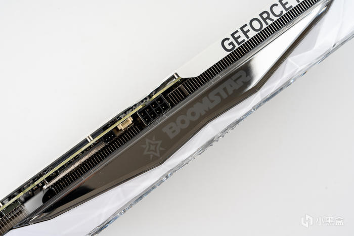 显卡的顶部则是显卡正面的延伸与带ARGB的BOOMSTAR星曜logo,整体两槽多的厚度