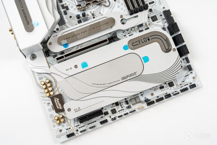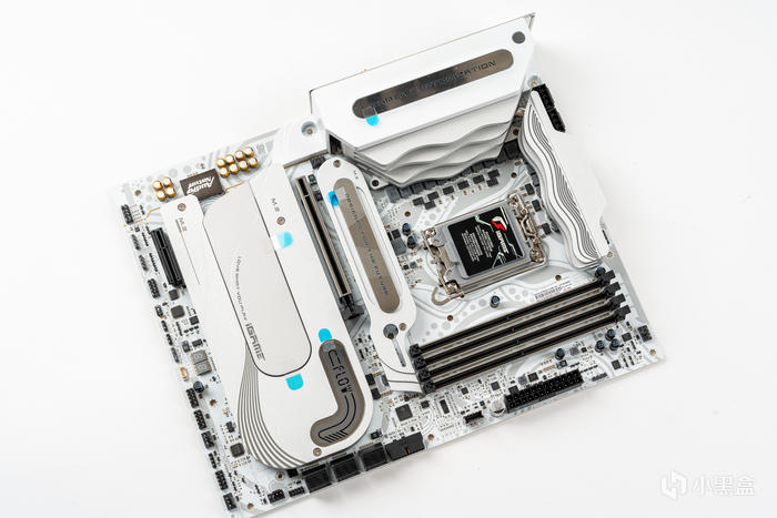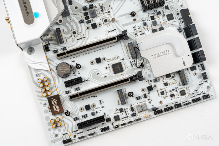 打开中间的PCIE隐藏盖和4条M.2散热装甲,整个PCIE区域提供了两条合金强化接口的全长X16插槽,不过第一条支持PCIE5.0 X16,第二条则贴心得设计了隐藏盖,支持PCIE4.0X4,中间还有一条PCIE3.0X1,最下面的一条则是开放式的PCIE4.0X4