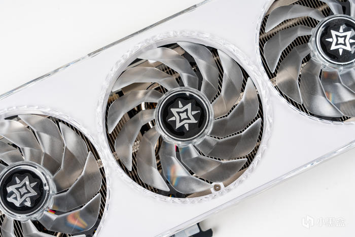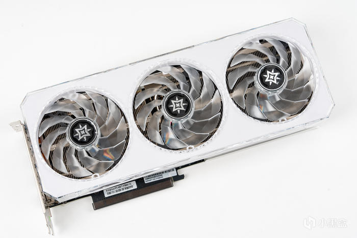 RTX4060TI 星曜 MAX OC显卡的本体,依然是星曜家族语言设计,全透明外壳下是白色的底壳,中间透明扇叶的静霜风扇