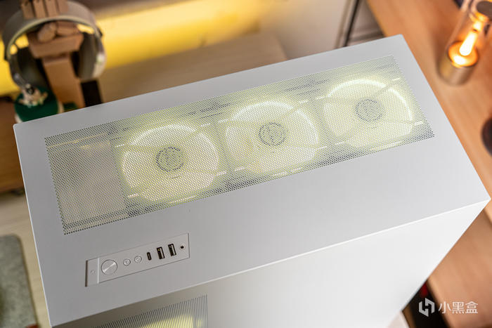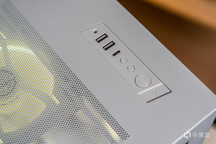 机箱的顶部面板也是冷排位大面积散热网孔的开孔设计,通风效果不错;前置IO开关面板在右侧,设计了重启键、电源键、灯光模式、灯光颜色、type-C、USB3.0、二合一音频口