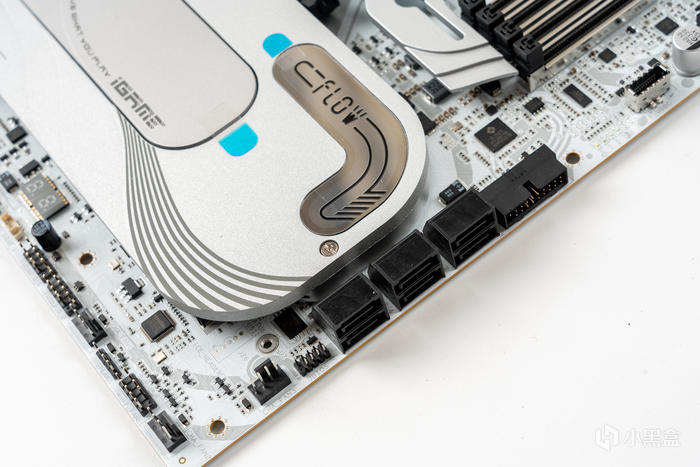 主板左侧提供的6个SATA3和一个前置USB3.0,一个带30W PD快充的type-C口,其中芯片组散热的FLOW还支持ARGB灯效与七彩虹iGAME CENTER软件控制
