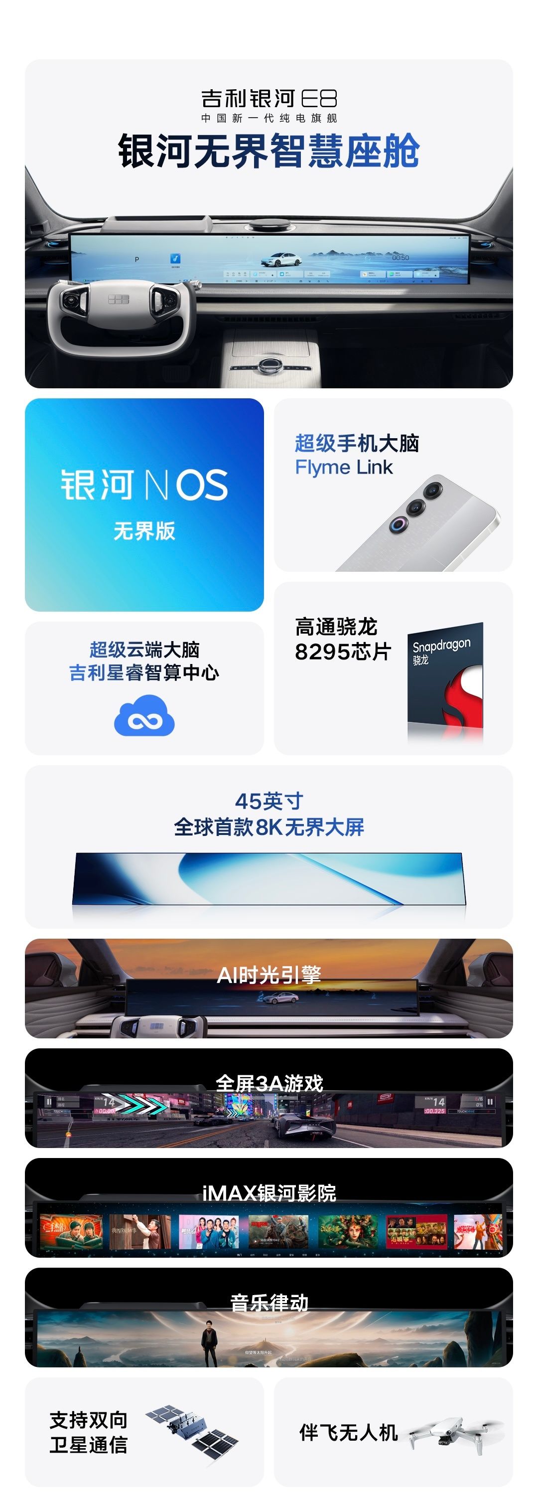 在硬件配置上,吉利银河E8凭借京东方45英寸8K无界智慧屏的加持,成功打造出全球最大、最清晰的车载显示屏。这一突破性的技术将为用户带来前所未有的视觉盛宴,重新定义座舱的智能化水平。