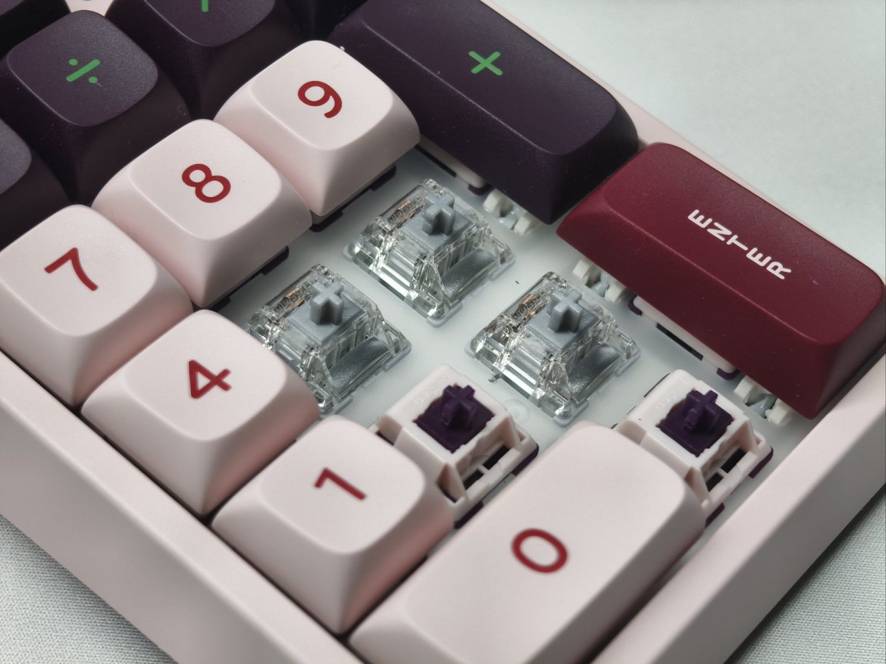 因为他是静音轴嘛,他的触底位置有着4位静音垫,他的上盖与底壳呢也都是有两块垫片的,在上盖与底壳撞击的过程中会显示出他的效果,在吸音降噪方面较为不错。