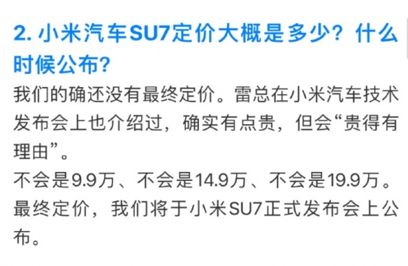 在价格方面,雷军再次申明:“我们的确还没有最终定价。雷总在小米汽车技术发布会上也介绍过,确实有点贵,但会‘贵得有理由’,不会是9.9万、不会是14.9万、不会是19.9万。最终定价,我们将于小米SU7正式发布会上公布。”