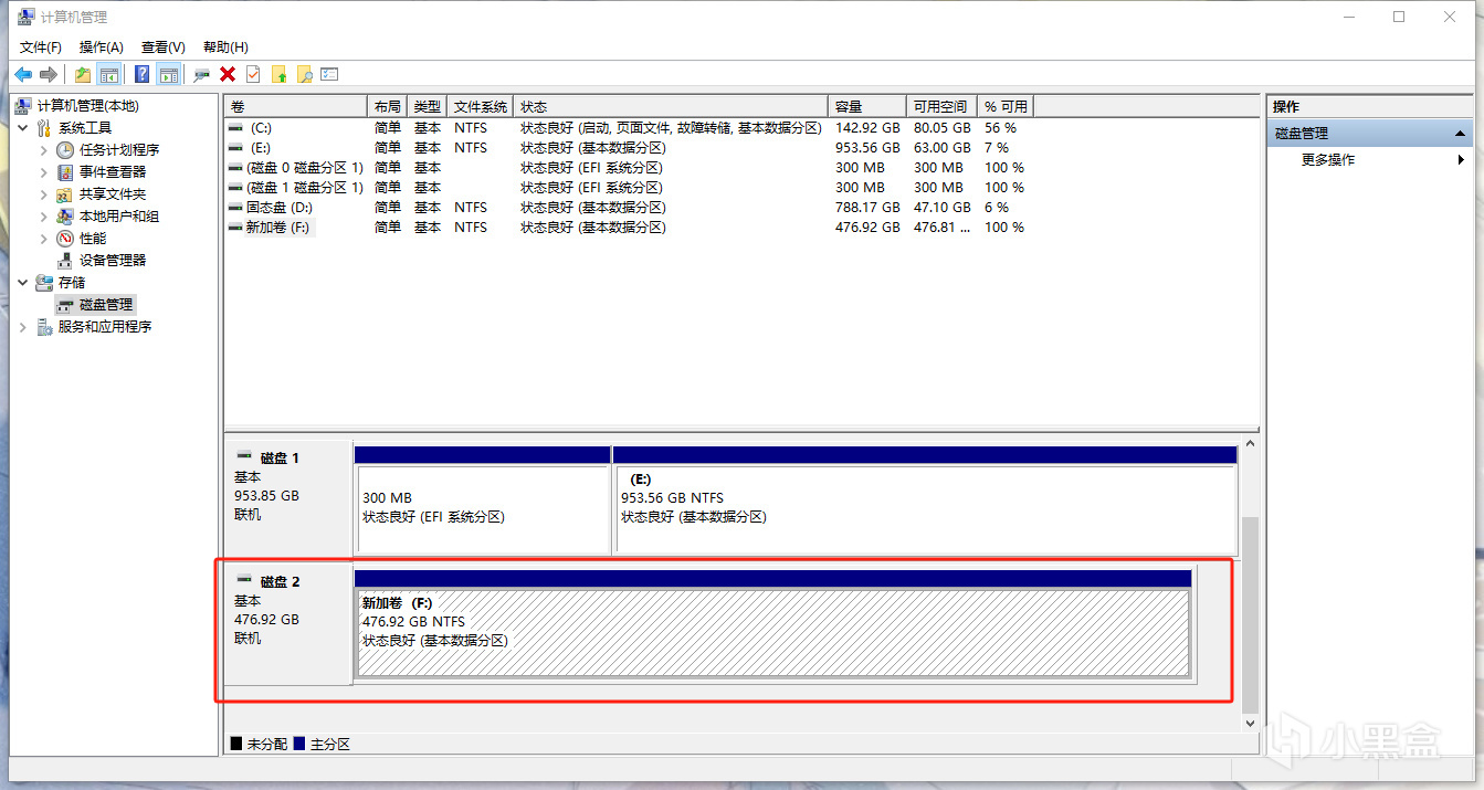 2.点击磁盘管理,这里面就可以看到新加的512G盘