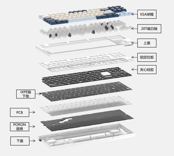 键帽、轴体、上盖、铝定位板、夹心硅胶、IXPE轴下垫、PCB、PORON底棉、下盖