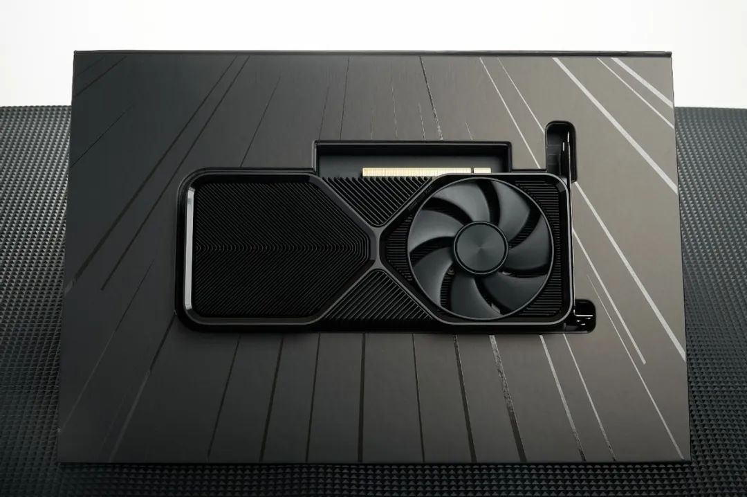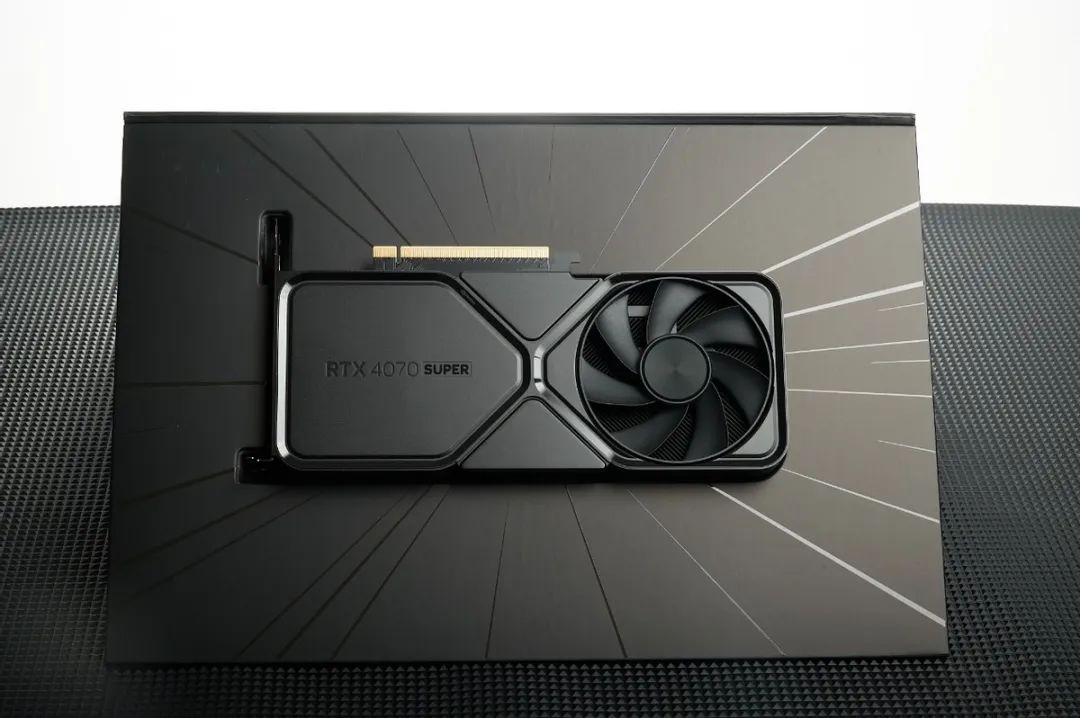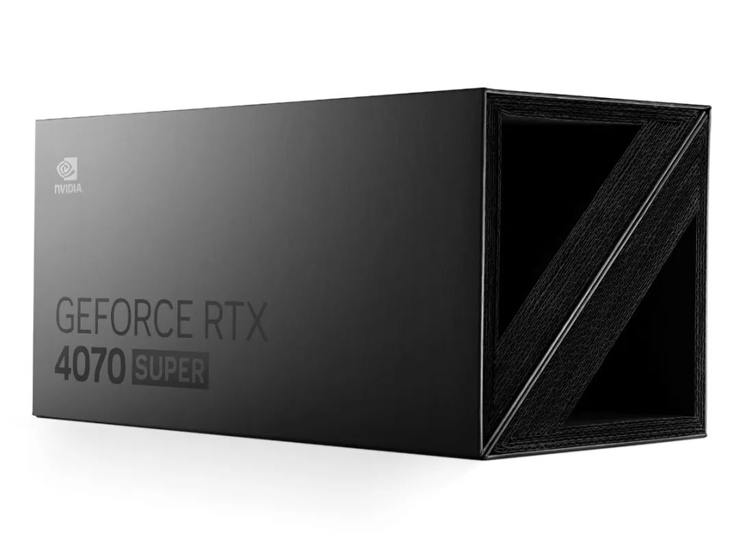 GeForce RTX 4070 SUPER Founders Edition在包裝上延續了與GeForce RTX 40系列FE的風格,使用黑盒子外翻的設計,撕開兩側封條,打開盒子之後,GPU內嵌在盒子正中央,此刻外包裝也變成了三角形的展示狀態,FE獨有的儀式感和展示效果仍舊拉滿。