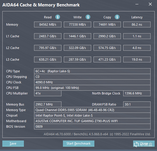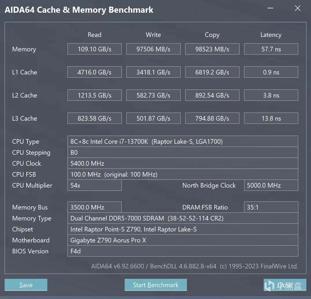 首先是在XMP默认频率下的表现,采用的平台为13代I5+华硕的Z790,表现数据如上图所见,并且为C42的时序,不过这个时序是默认的时序,在实际中其实是可以压到比较低的程度的,然后~小超不是超!直接跳过默认的最高频率6800,拉到7000再说。