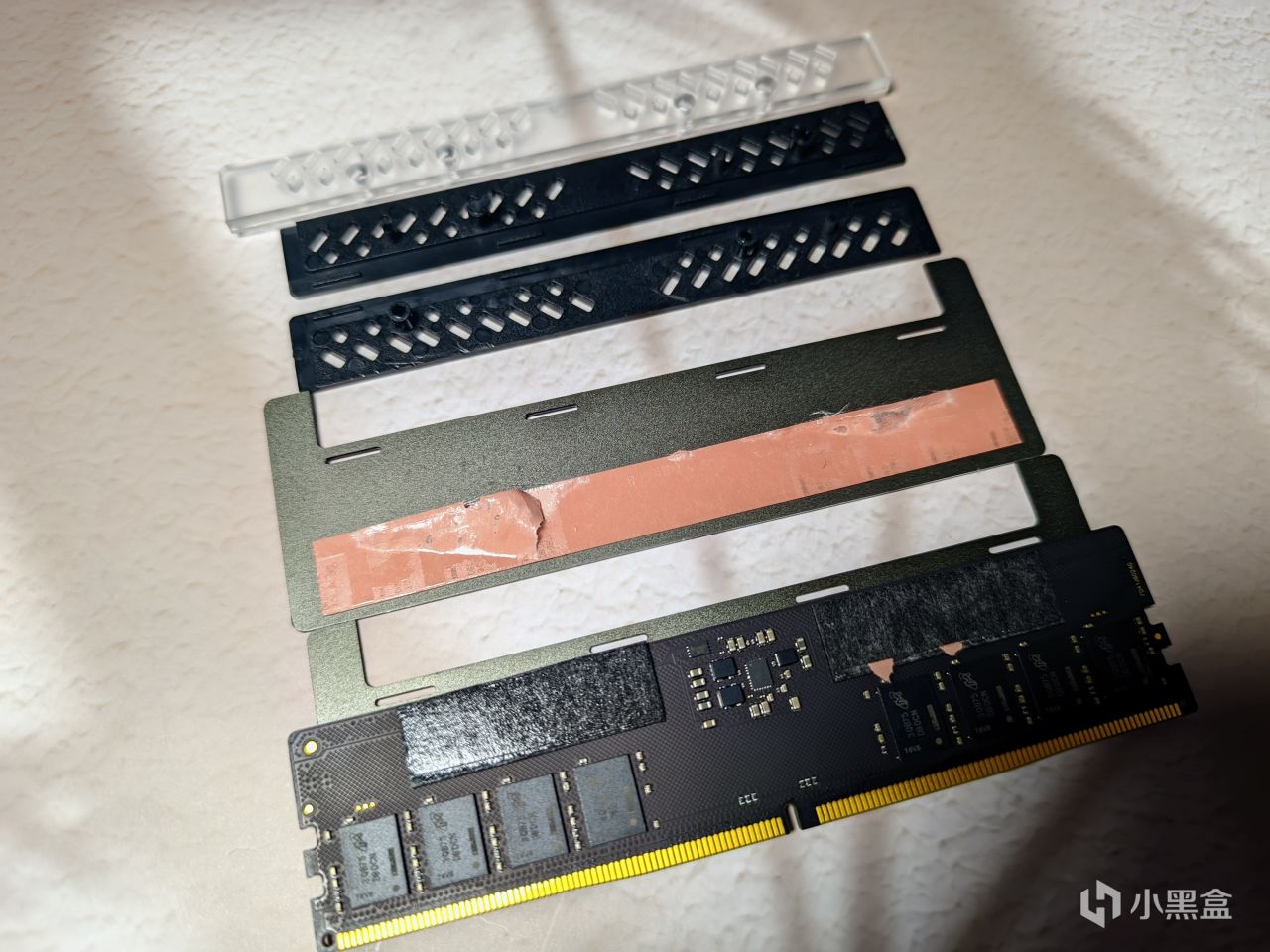 这款内存条与其他内存条不同的是,因为采用的是夹片工艺,所以拆除的顺序应该是从上往下,从外到里,在取下黑色的加固条之后,再去掉导光条,就可以扯开两片金属背板了,不过与哥们说的不一样,这次硅脂贴倒是一体式并且几乎完全覆盖到了颗粒上,所以官方也看评论区?