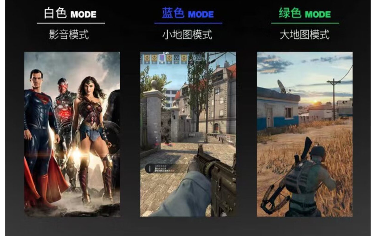 上面也讲了按下他的LOGO可以调节三种模式,分别为影音模式,小地图模式,大地图模式。对应的就是你平常的娱乐,瓦罗兰特,CSgo这类游戏以及永劫无间,PUBG这种大逃杀游戏。对各个游戏都做了优化还是很不错的。