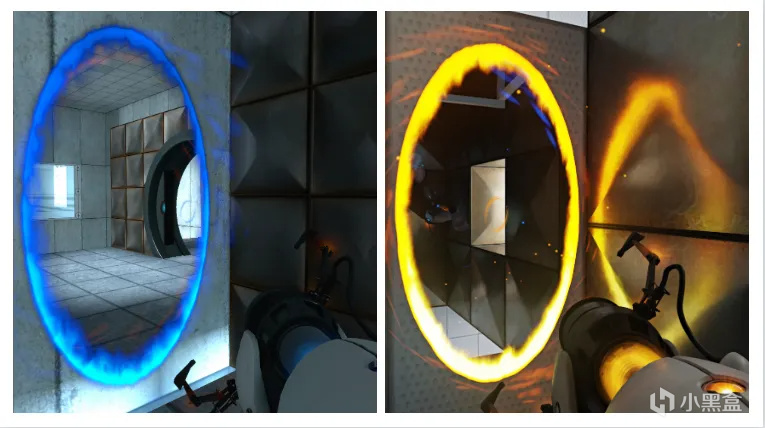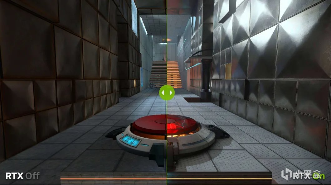 ▲这里再附上我之前实测的画面截图对比:左侧为原版,右侧为RTX版游戏,大家可以清楚的看到,原版在开启传送门时,门右侧的金属墙壁与传送门之间没有任何的互动,感觉门与墙完全存在于两个不相关的维度。而右侧RTX版本中,在开启传送门的同时,右侧墙壁上也有着明显的传送门倒影,且其金属的质感一下子就体现了出来。