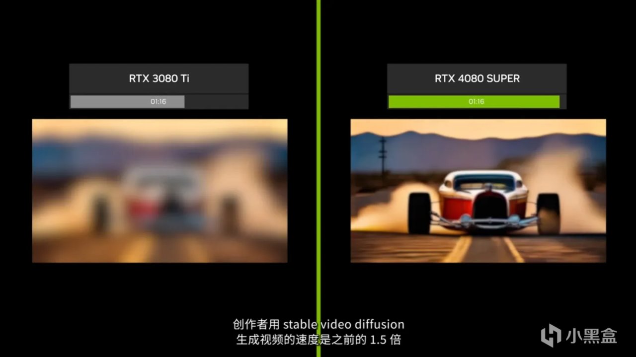 ▲除了更强的游戏性能,RTX 4080 Super还拥有836 TOPs的AI算力,是目前最强CPU的20倍左右,其Stable Diffuision生成视频的速度也是RTX 3080 TI的1.5倍,生成图片时,速度则是RTX 3080 Ti的1.7倍。
