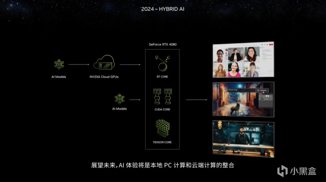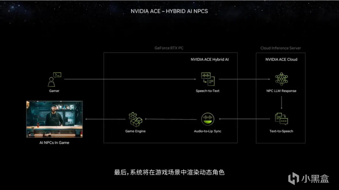 ▲首先我们说一说NVIDIA ACE平台,这便是PC端AI与云端AI配合的混合式AI应用,能够“赋予游戏NPC灵魂”,让玩家的游戏体验更加真实,沉浸感更强。