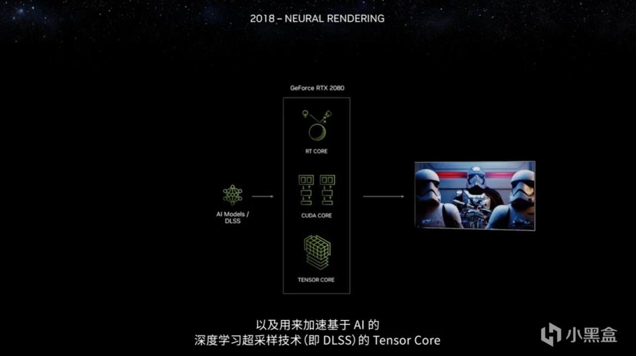 ▲除了CUDA CORE,安培架构的GeForce RTX 20系显卡还整合了用于光线追踪的RT CORE,用于基于AI的深度学习超级采样(DLSS)的TENSOR CORE,光线追踪+DLSS的这个改变了游戏画面渲染的技术黄金组合从此正式开始。