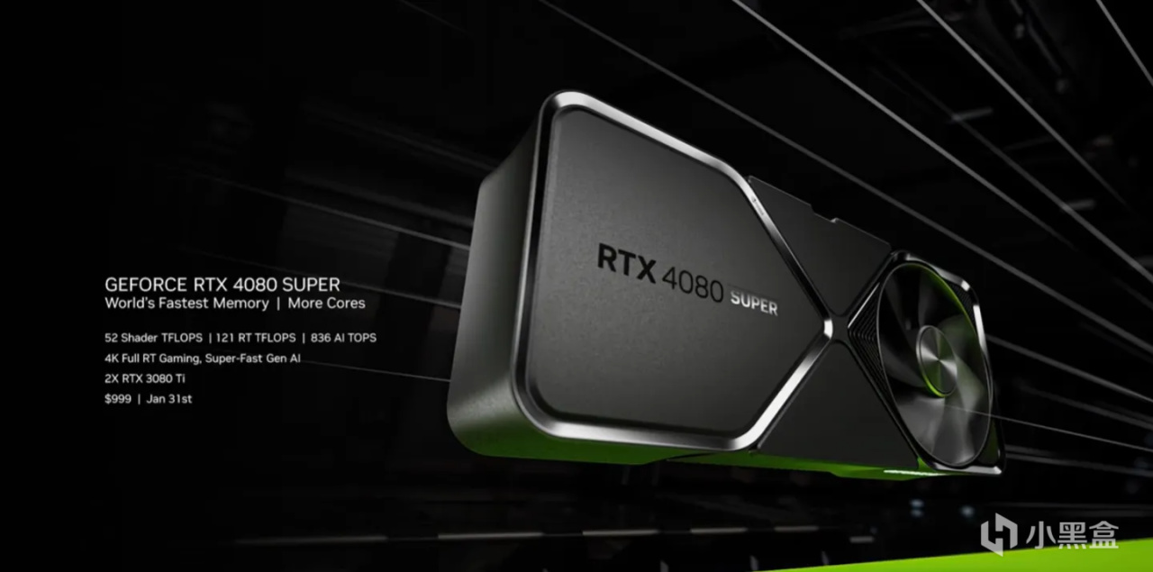 ▲NVIDIA GeForce RTX 4080 Super显卡将于2024年1月31日发售,售价999美元,可以在4K分辨率下畅玩3A光追大作,在DLSS的加持下,游戏帧率可达RTX 3080 Ti的两倍。