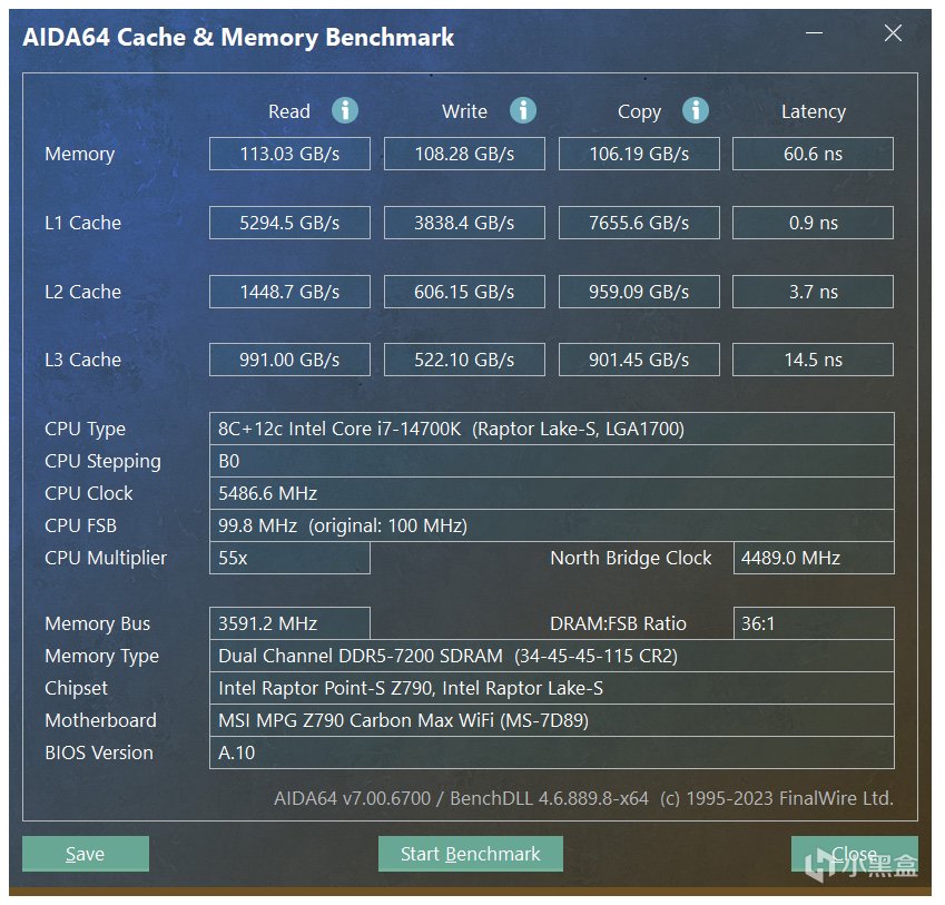 读取速度达到了113030MB/s,写入速度达到了108280MB/s,复制速度为106190MB/s,延迟为60.6ns。