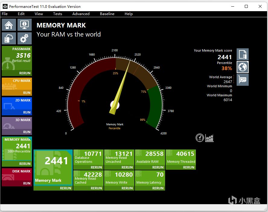 PerformanceTest 11.0内存项目得分为2441分。