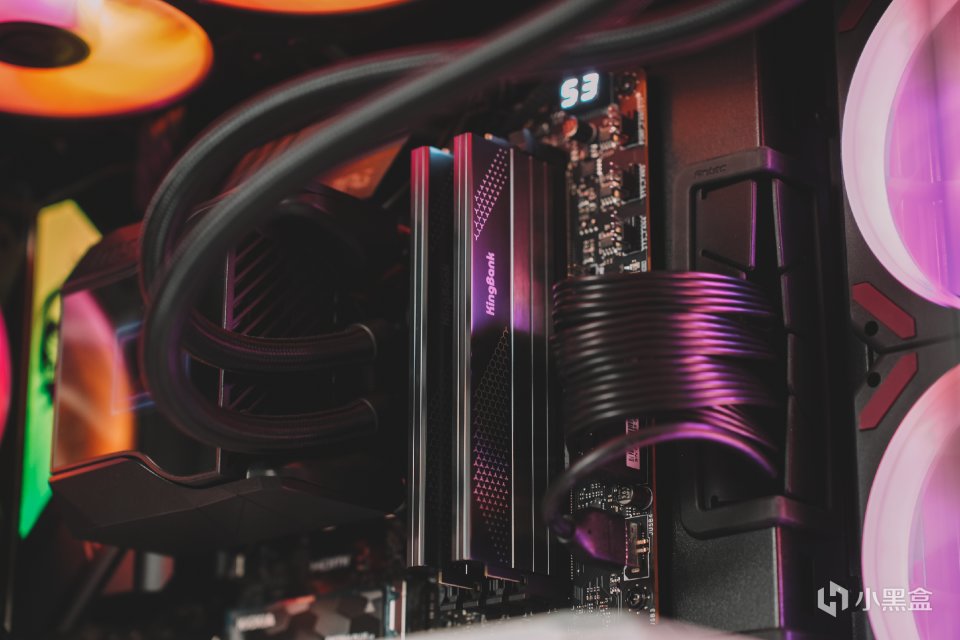 散热器用的是最新的微星MPG CORELIQUID D360,该风扇可以说是之前旗舰级S360水冷的兄弟版,最大的亮点是水冷头上搭载了一个60mm的下压风扇以及一块2.4 英寸IPS面板屏幕,不但可以显示本机CPU 温度、水泵风扇转速等一系列信息,还可以通过MSI CENTER软件自定义图片、视频等内容,玩法更加个性化。