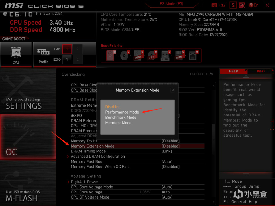 不过值得注意是,微星主板BIOS有一个功能可以让内存性能大幅度提升,只需要在OC选项将Memory Extension Mode开启到Performance Mode即可。