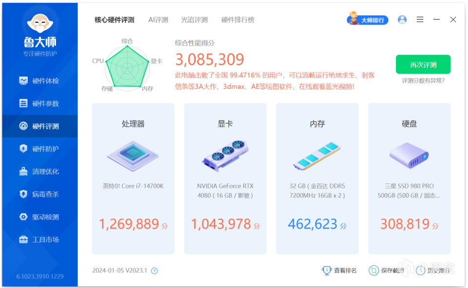 鲁大师内存得分为462623分。