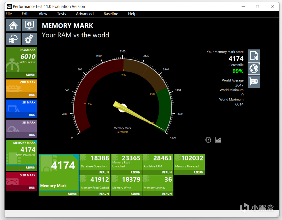 PerformanceTest 11.0内存项目得分为4174分。