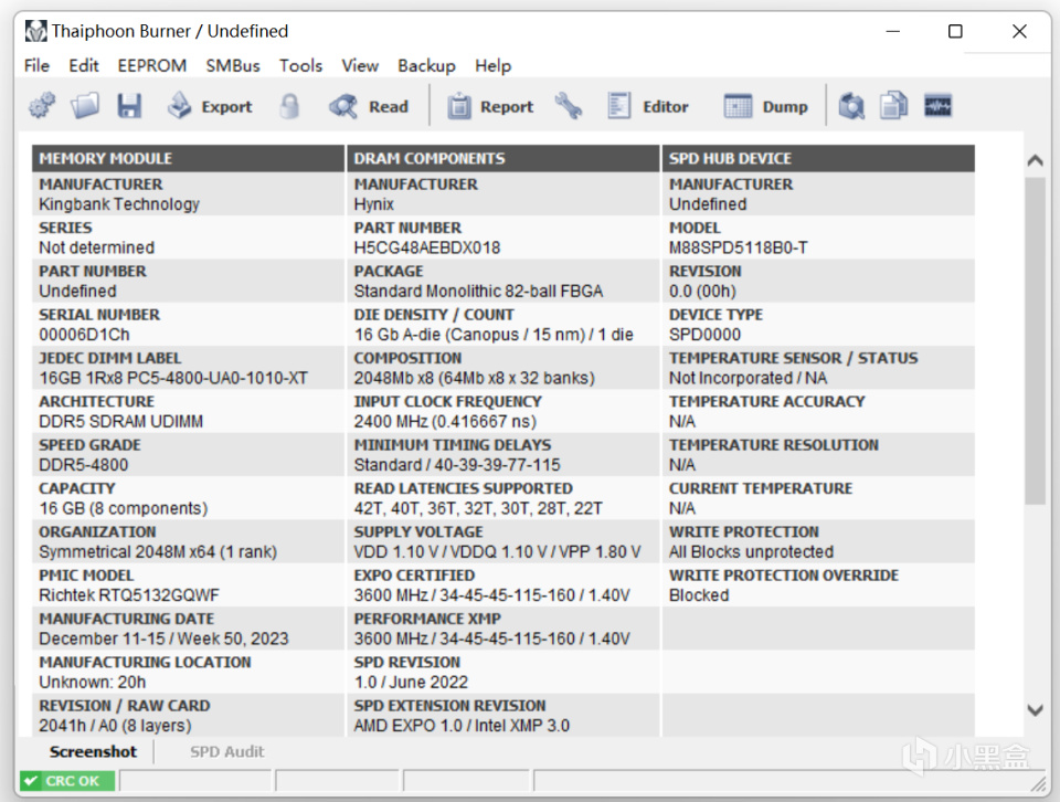 在通过Thaiphoon Burner台风软件实测,该内存颗粒编号为H5CG48AEBDX018,也属于口碑也非常不错的海力士A-DIE颗粒版本