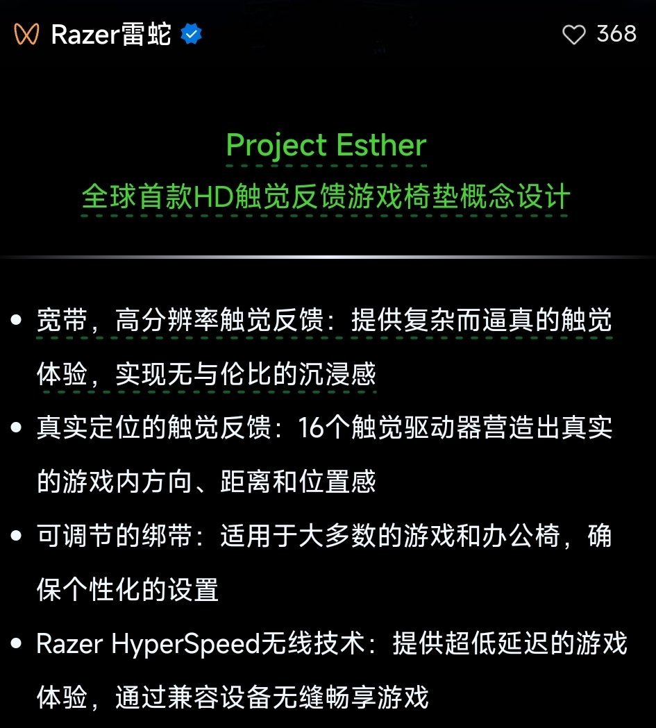 雷蛇在2024国际消费类电子产品展览会(CES2024)上,推出了全球首款触觉反馈椅垫,ProjectEsther。对,你没有看错。是椅垫,不是椅子!