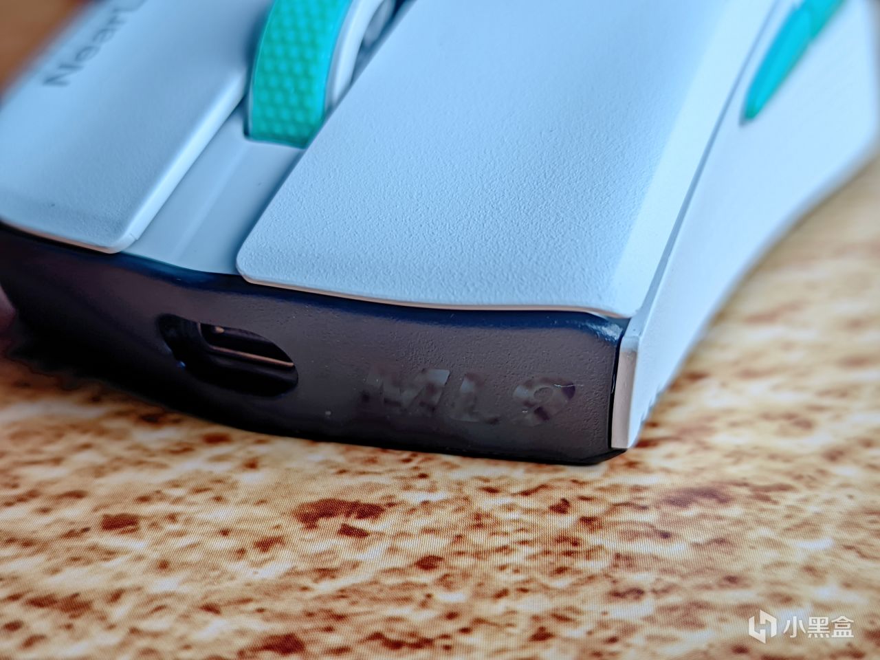 从鼠标的顶面可以看到其本身的C口做了一定程度的深挖,对于线材方面有所保护,但好消息是其本身并没有做过深的处理,所以即使是电竞用的弯头数据线,也可以正常插入,同时在顶部有做产品名的标记,看着还挺有意思。
