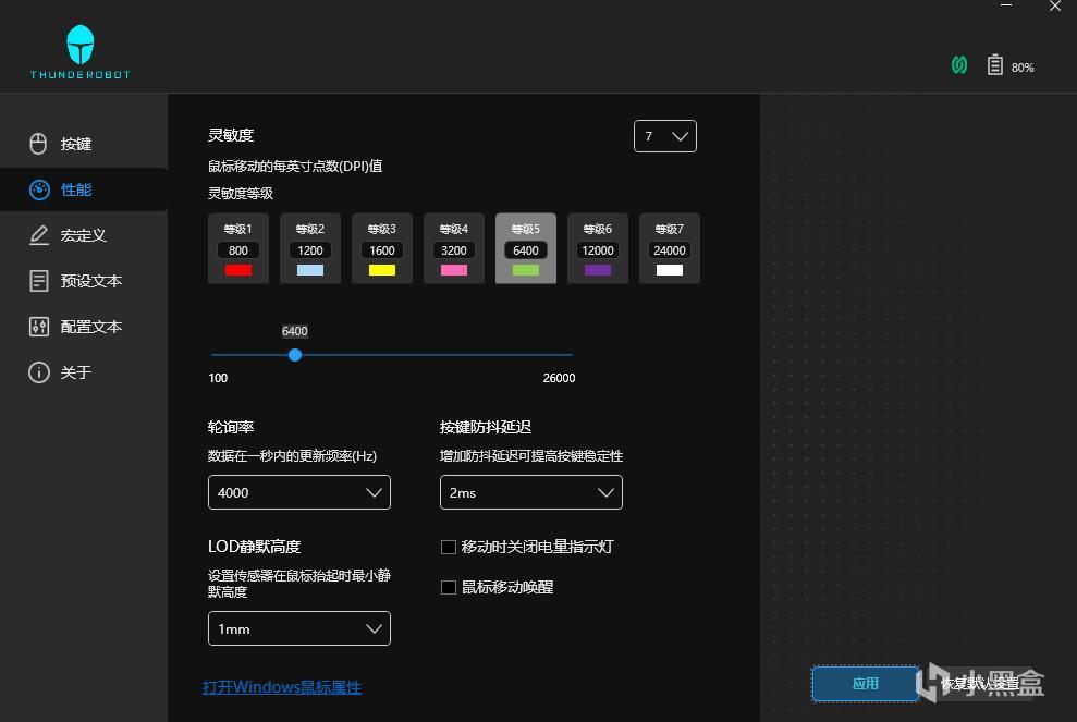 鼠标的驱动似乎采用的还是公版的逻辑,左上角为LOGO,右上角为星闪标志和电量显示,在2.4g模式下,可以在性能模式中拉倒最大4k的轮询率,且可以将防抖拉到2ms,而LOD则是可以选择1mm和2mm,并没有其他的选择了。