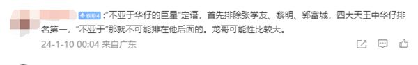 有网友分析:“不亚于华仔的巨星”定语,首先排除张学友、黎明、郭富城,四大天王中华仔排名第一,“不亚于”那就不可能排在他后面的。龙哥可能性比较大。