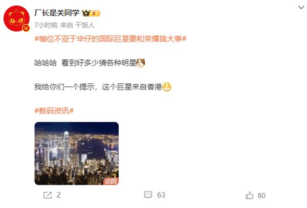 日前,数码博主“厂长是关同学”爆料,荣耀将与一位国际巨星合作,咖位不亚于刘德华。
