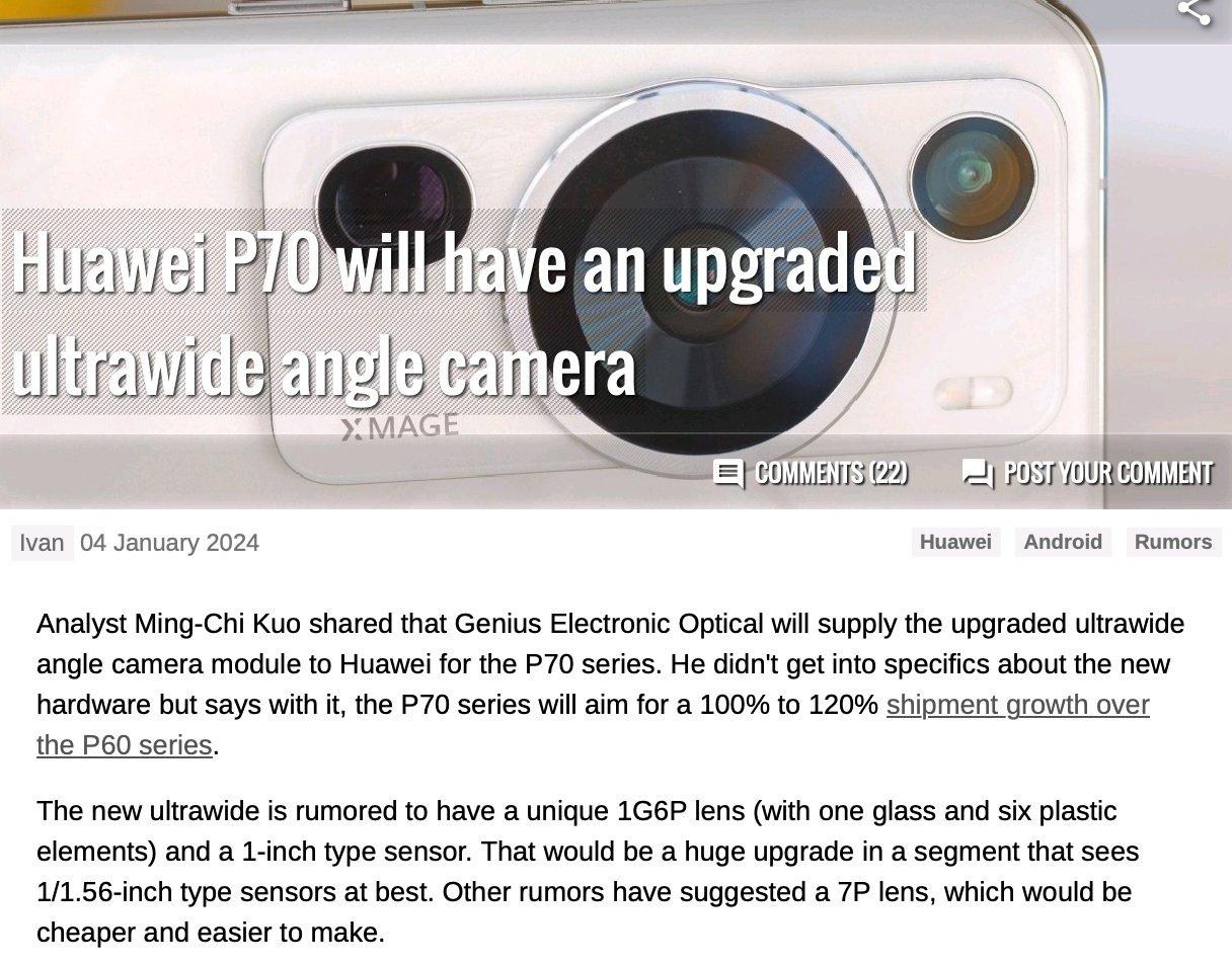 ——华为P70系列或将配备,1 英寸超大底主摄、1G6P 结构(一层玻璃镜片 + 六层塑料镜片)超广角、100mm 焦段 4 倍潜望,的三摄超级影像矩阵 !