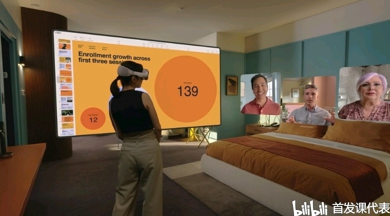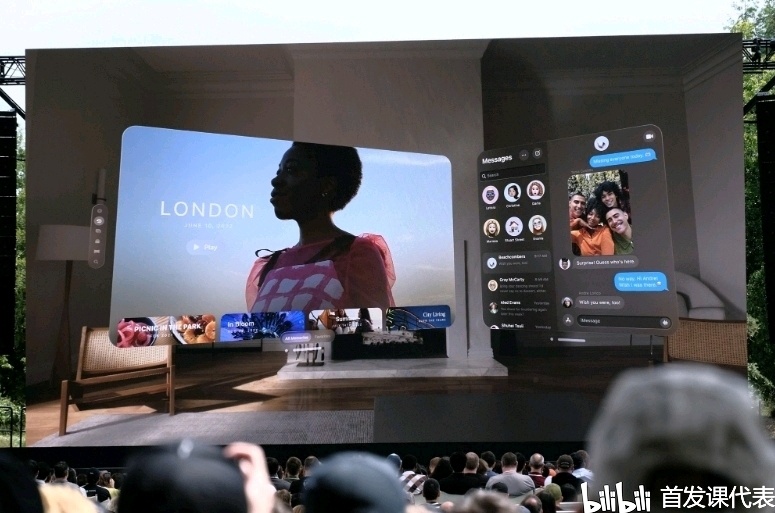 该设备使用透视视频让用户可以看到全彩色的真实世界,用户也可以将 3D 物体投影到真实空间中,包括从消息线程中把物体拉出来放到真实世界中。Vision Pro 上的 FaceTime 可以在视频通话时显示真人大小的人物,还优化了查看照片和视频的体验。Vision Pro 也是“苹果的第一款 3D 相机”,可以通过空间音频在视频中显示深度。该头显具有影院级视频观看体验,可将屏幕缩放至超出房间的尺寸。