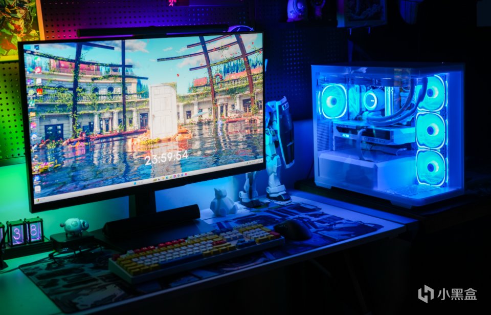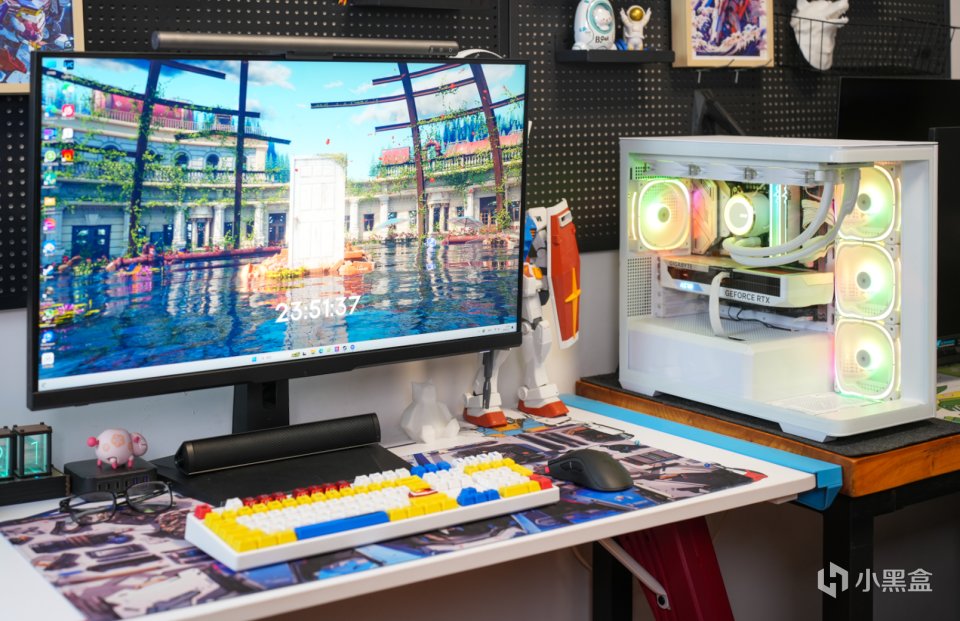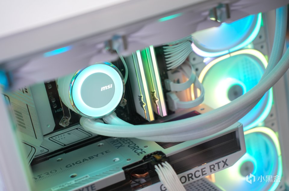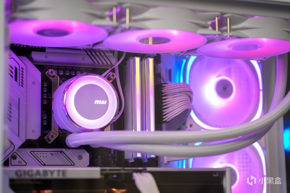 为了压制住i7-13700K,我用了一款纯白散热器——微星MAG CORELIQUID E360水冷。该散热器也是目前我手上最好看、性能最强的纯白散热器。其水冷头设计比较有意思,顶盖支持RGB灯效+270°旋转,装机可以更好看;同时内部则是搭载的是一个三相减震马达,进一步降低水泵运行时的振动,保证整个水冷系统的长时间稳定运行。