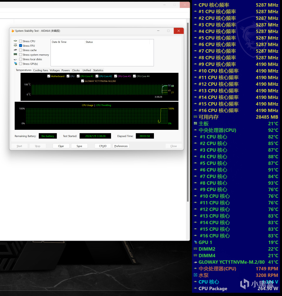 温控方面,乔思伯D300的表现与D301差不多,在室温20℃(开空调)的情况下,AIDA64单烤FPU 10分钟,i7-13700K不用手动降压,功耗为260W,依然可以将核心温度控制在92℃左右,如果适当降压操作,预计满载温度也就80℃出头。