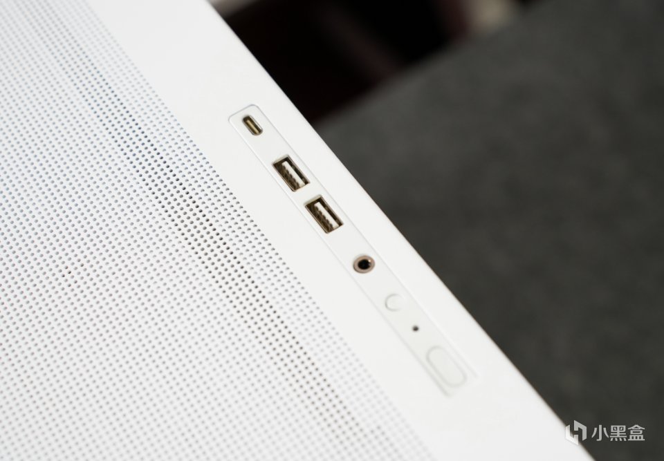 如机箱的I/O的接口被放置在了顶部,分别是2个USB 3.0(5Gbps)一个Type-C(10Gbps)、一个3.5mm音频、再加上重启以及电源按键。