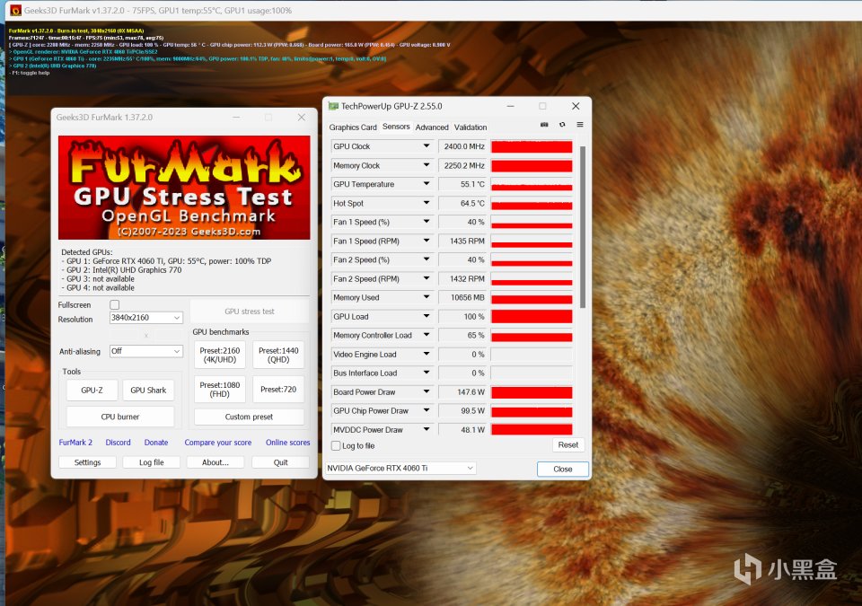 显卡方面通过FURMARK拷机实测,温度也就60℃出头。当然本身技嘉RTX4060Ti显卡的功耗本来就不算高,再加上三风扇的加持,温度表现卓越也不奇怪。
