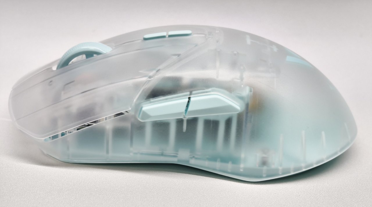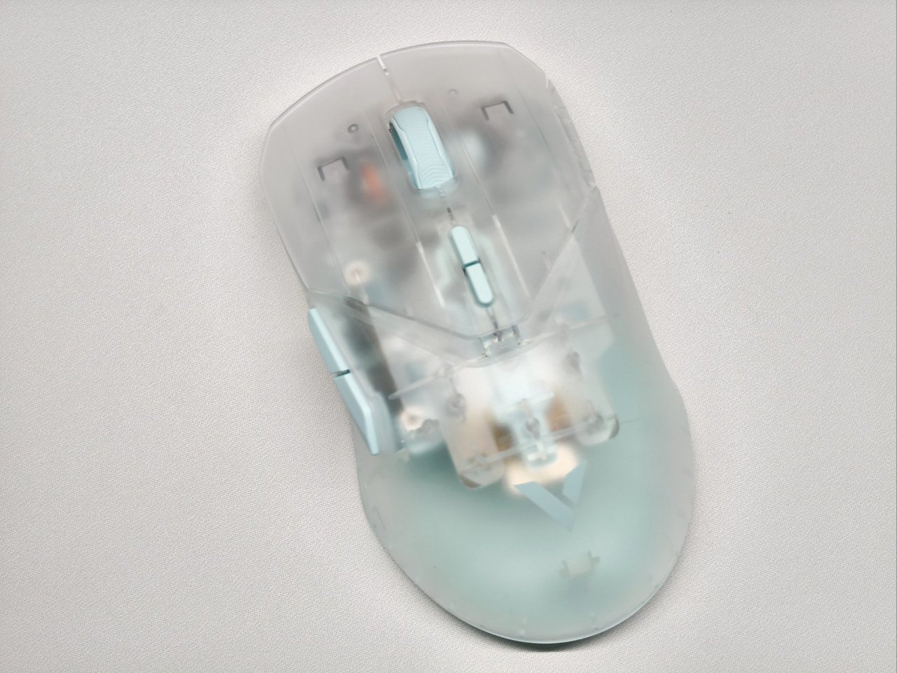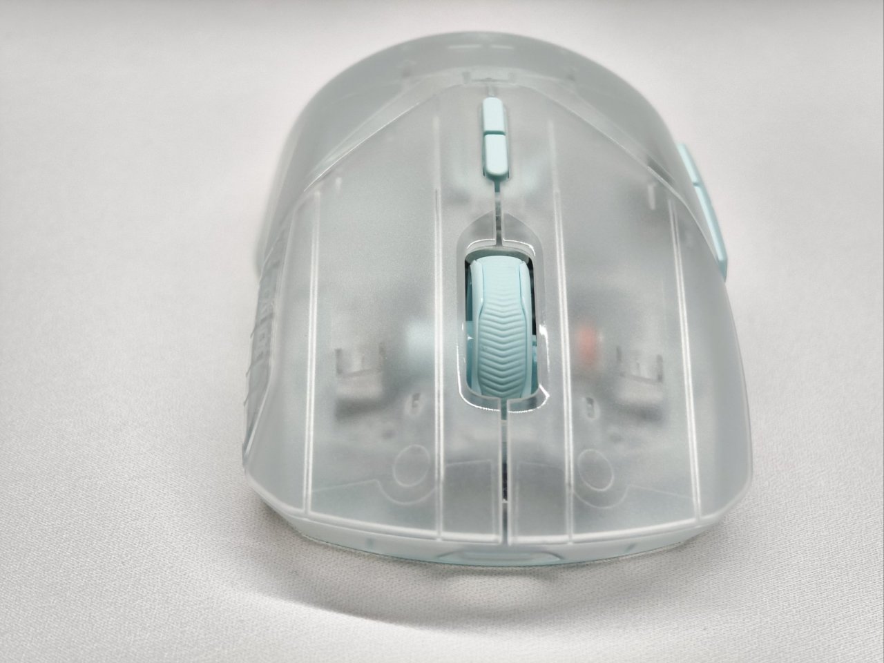 VT9AIR的这个外观我确实是爱了,半透明的风格你可以略微模糊地看到鼠标内部的零件,但有一种朦胧美 ,它不仅仅是壳子是透明的,鼠标滚轮还有配对的按键,雷柏的LOGO这些也都是蓝色的。
