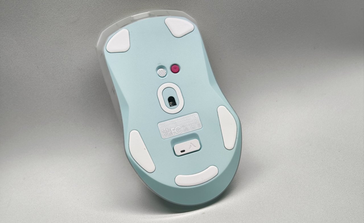 底部布局简洁,可以贴上赠送的特氟龙脚贴提升顺滑度,传感器方面采用了中置布局,上方两个按钮分别为电源开关(黑色)以及自定义按钮(红色),默认更改DPI键,后续可以改为其他的,并且因为在底部可以防误触。下方的正方形处为鼠标的2.4G收纳仓,与VT9PROminni不同的是它少了那层盖子,也就不支持雷柏的无线充模块了。并且还有一点我要吐槽一下!为什么我这款是透明的,他给我配个黑色的脚贴合黑色的防滑贴,这不就白瞎了这颜值了嘛,我这边建议最好把防滑贴和脚贴换成蓝色的或白色的