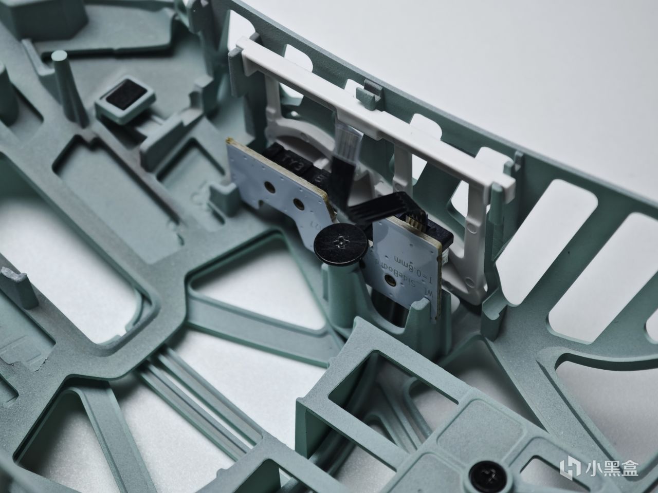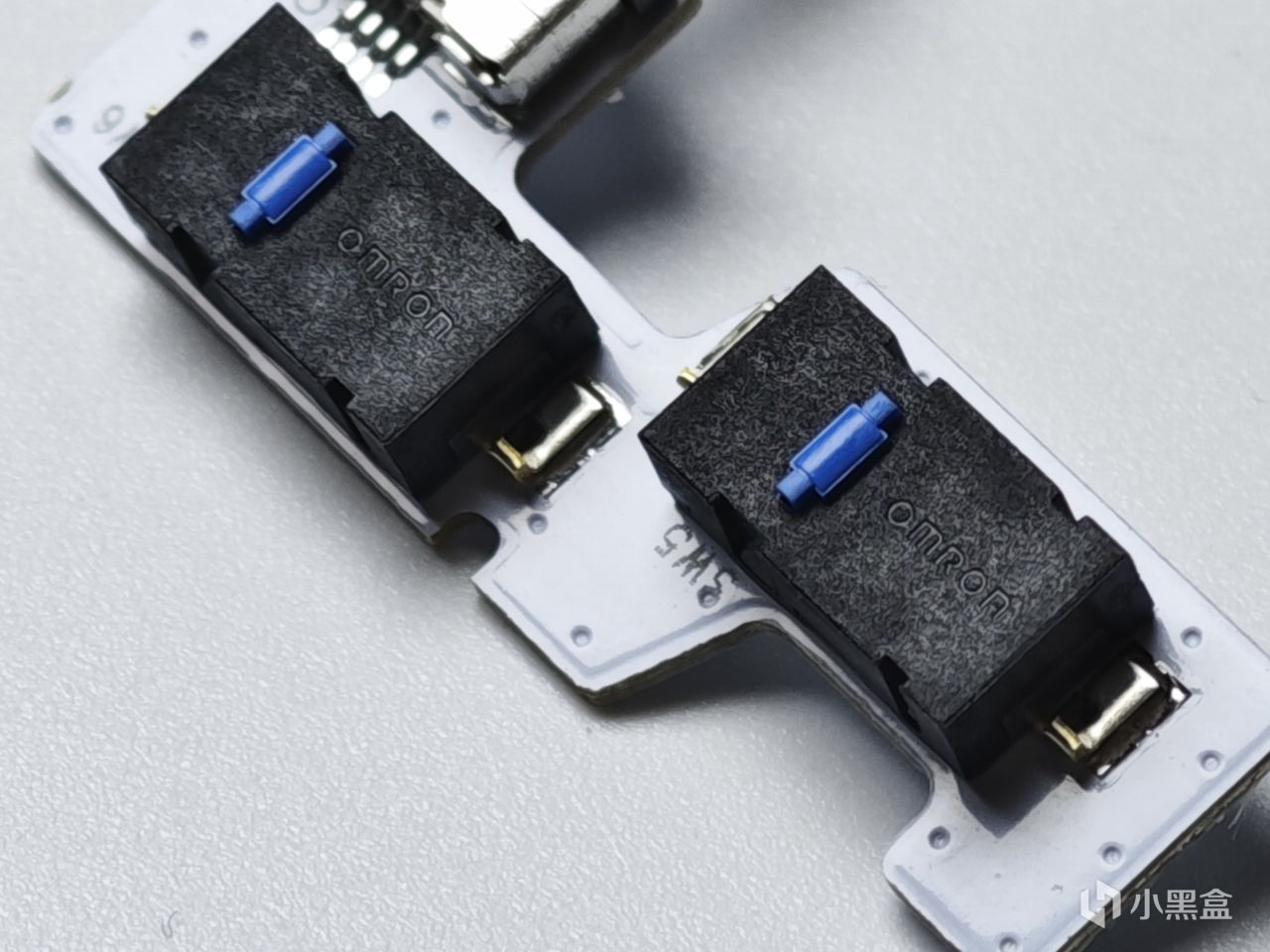 侧键的PCB小板是通过排线链接到PCB,使用螺丝固定在上盖上,同时可以看到采用的是微动按键而非贴片,手感上会好很多,通过微动上的字符查询得知为欧姆龙出品,手感以及声音都是相当不错的。