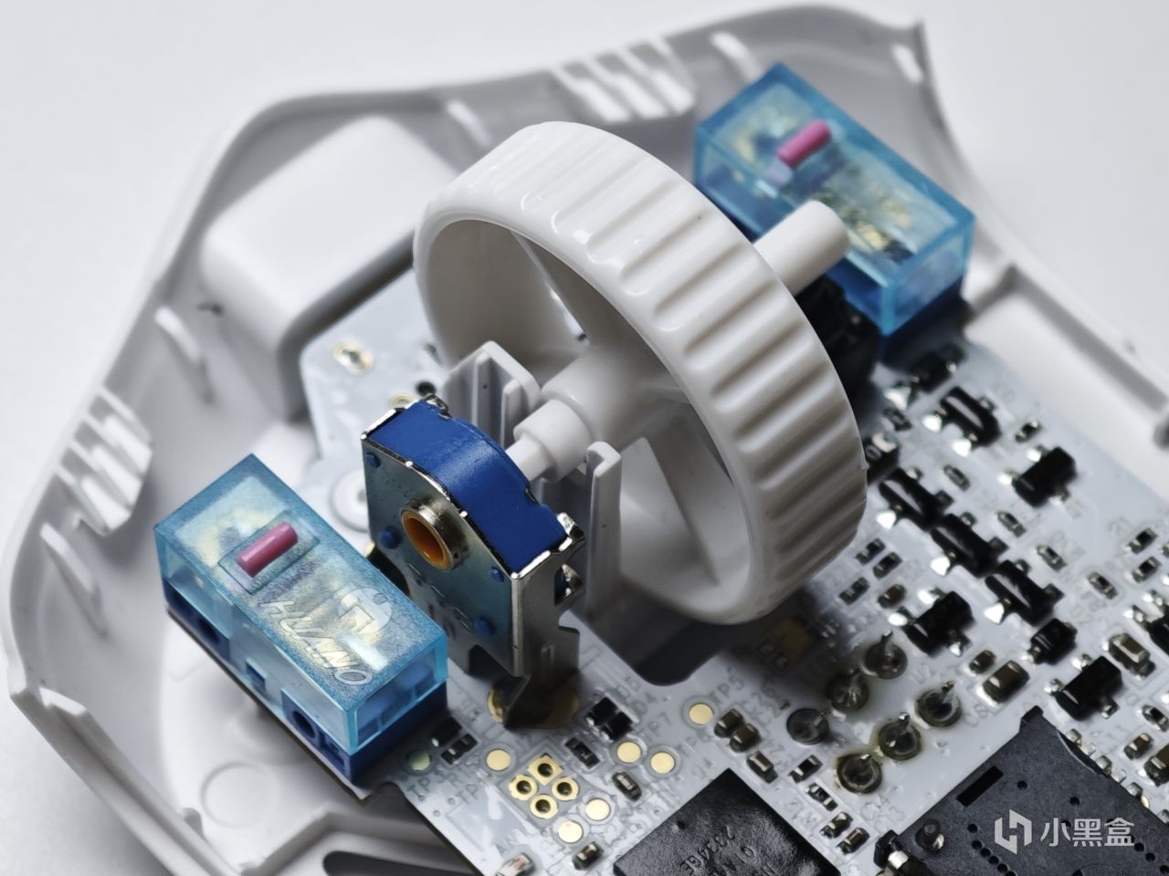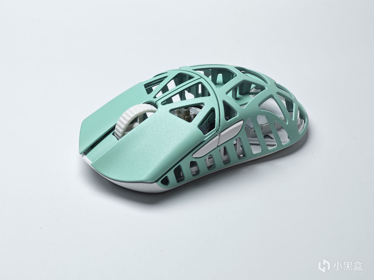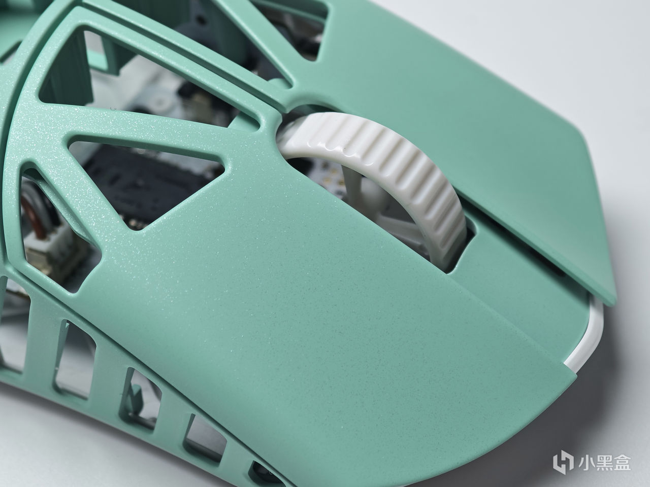 滚轮、侧键以及底壳采用的都是塑料,从颜色上也能很好的区分,镁合金部分为青绿色,白色则就是塑料了。同时可以看到,滚轮里边有做镂空处理,进一步缩减了重量,但同时手感并没有变差。
