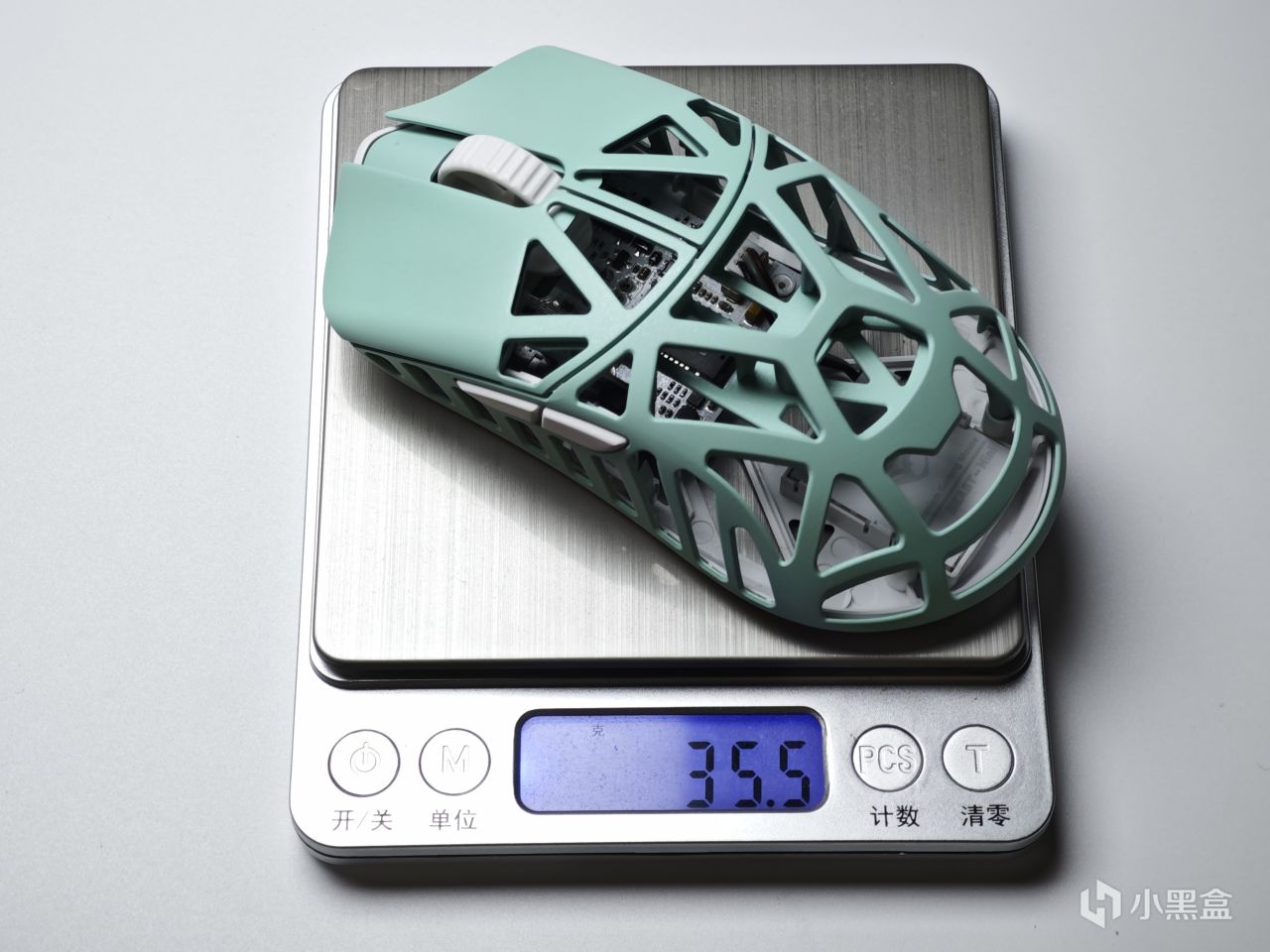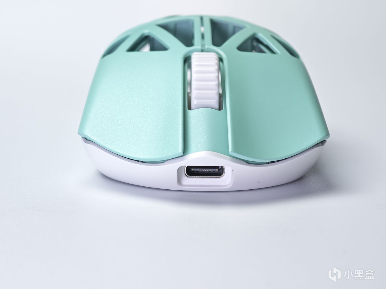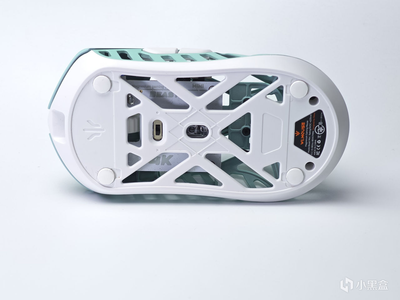 我这一款的配色是花·兽MINI的薄荷配色,整体的风格是很小清新的,同时可以看到表面大范围打孔,能更好的减少鼠标重量,但同时因为上盖采用的是镁合金,所以鼠标本身的强度以及支撑也是非常不错的