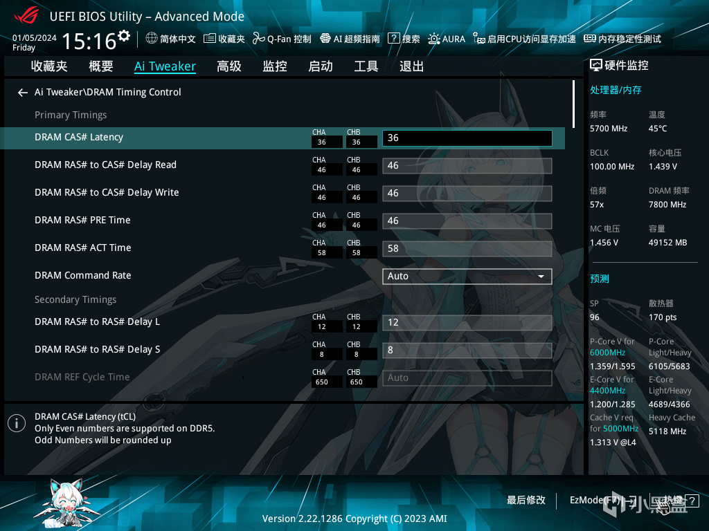 (2x24GB)冰刃Hermes RGB DDR5 7200C36-46-46-115 XMP设定AIDA64内存和缓存测试