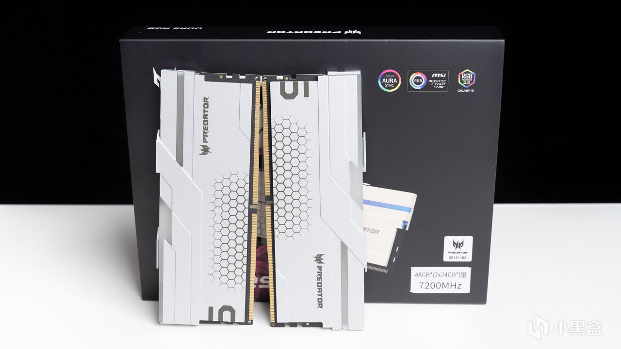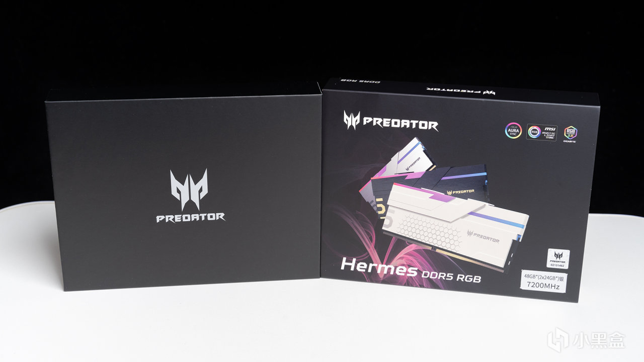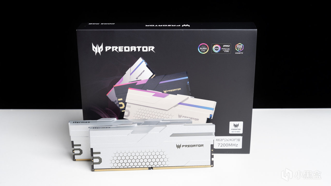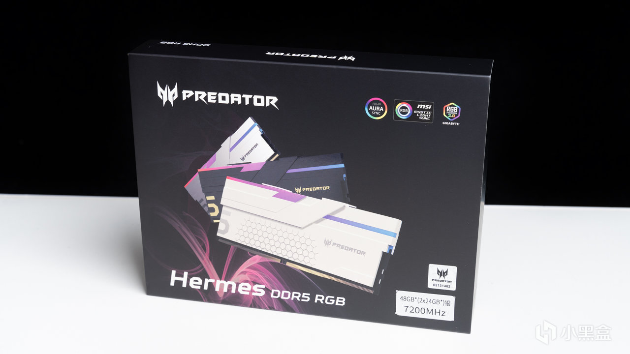 这次耍的内存来自宏碁掠夺者的冰刃Hermes RGB DDR5 7200 48GB(2X24GB)套装,包装正面展示了冰刃DDR5白色、黑色和银色三种配色的渲染图,右上方是各家主板厂商的灯光软件支持标注,和之前2X16GB套装是一样的。
