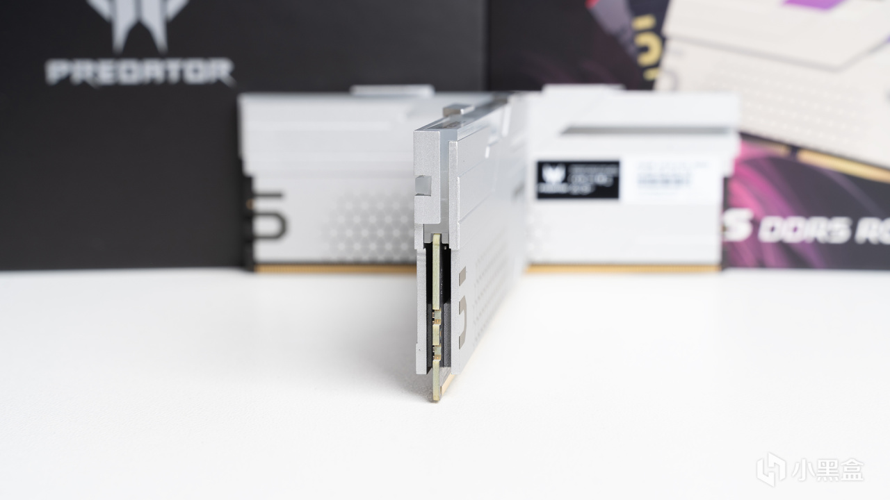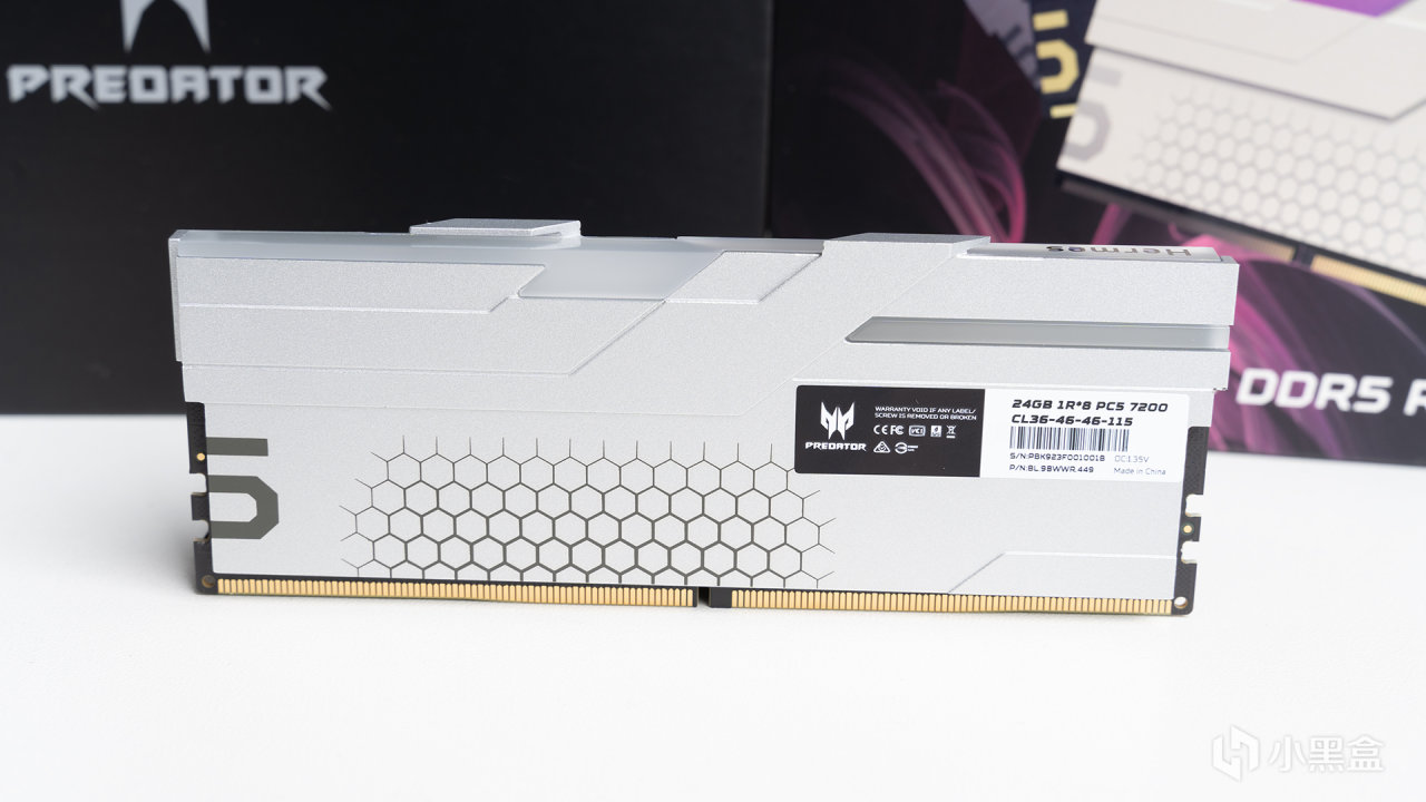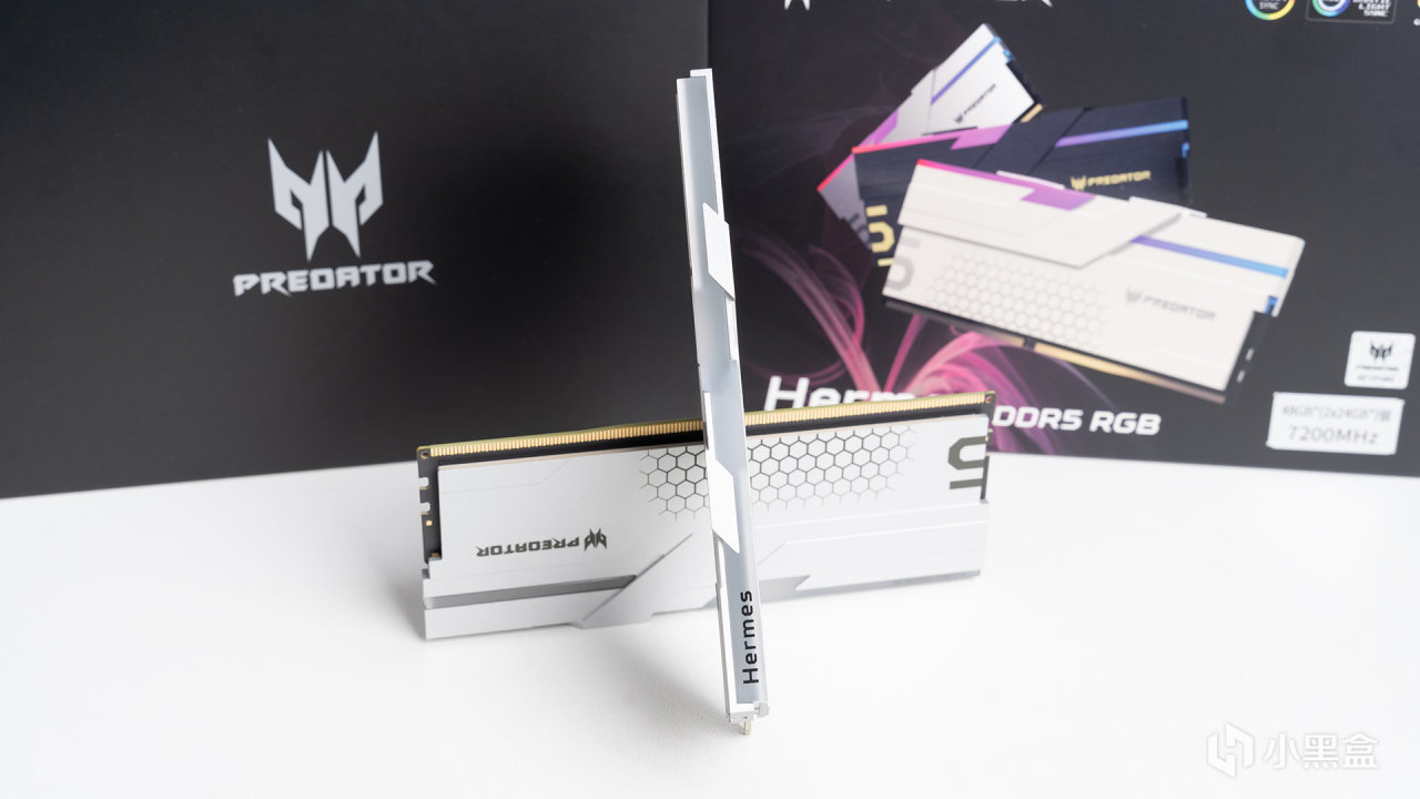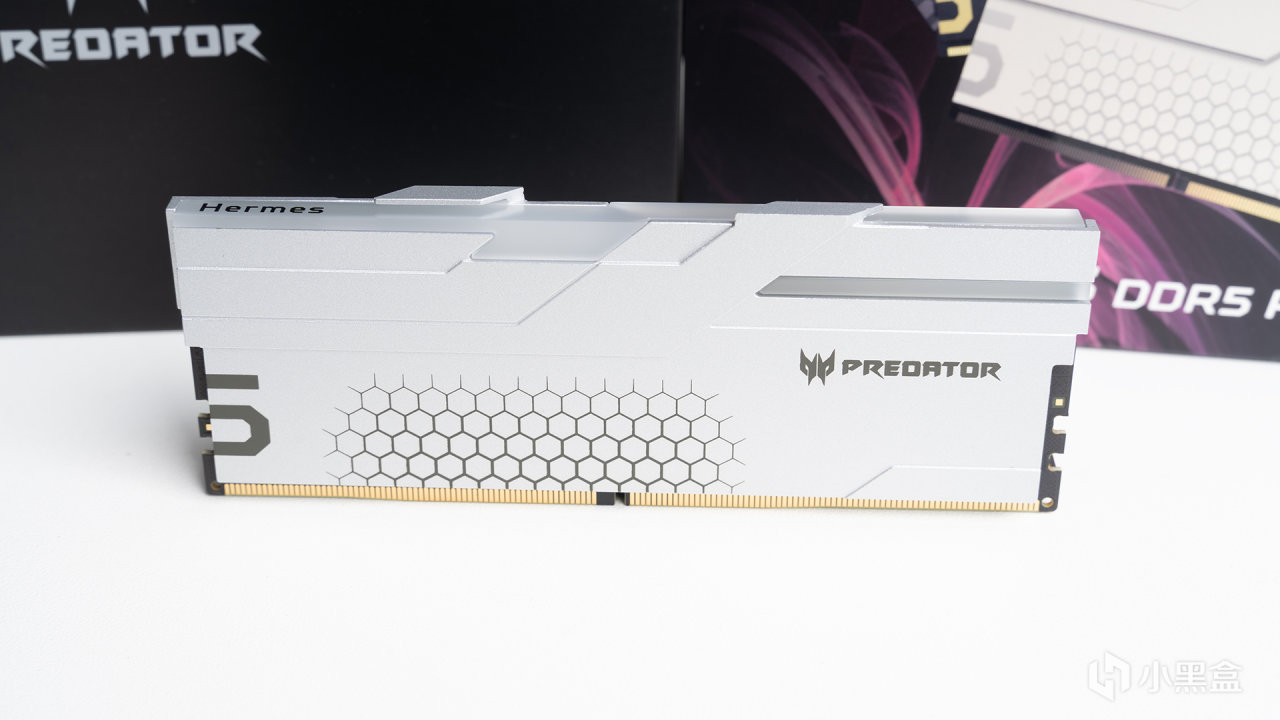 手上这套是冰刃Hermes RGB DDR5银色版本,它采用了凌厉造型的冰刃散热马甲——表面不但有多层线条和结构堆叠凸显立体感,而且散热片上有PREDATOR的LOGO和规律的六边形(代表着冰刃)图案加持,整体散热马甲覆盖面积足够大,能保证内存稳定高频运行。